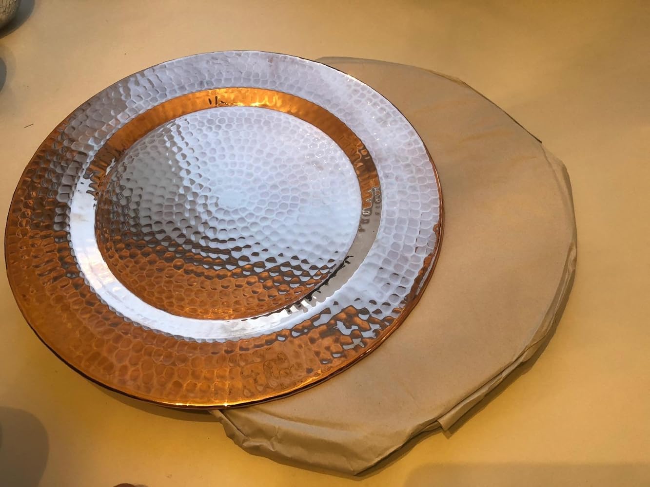 The Thessaly 13” Copper Charger Plate is hand-hammered from heavy-gauge solid copper — designed to cast a warm, intimate glow across your table or create a dazzling shine under candlelight.